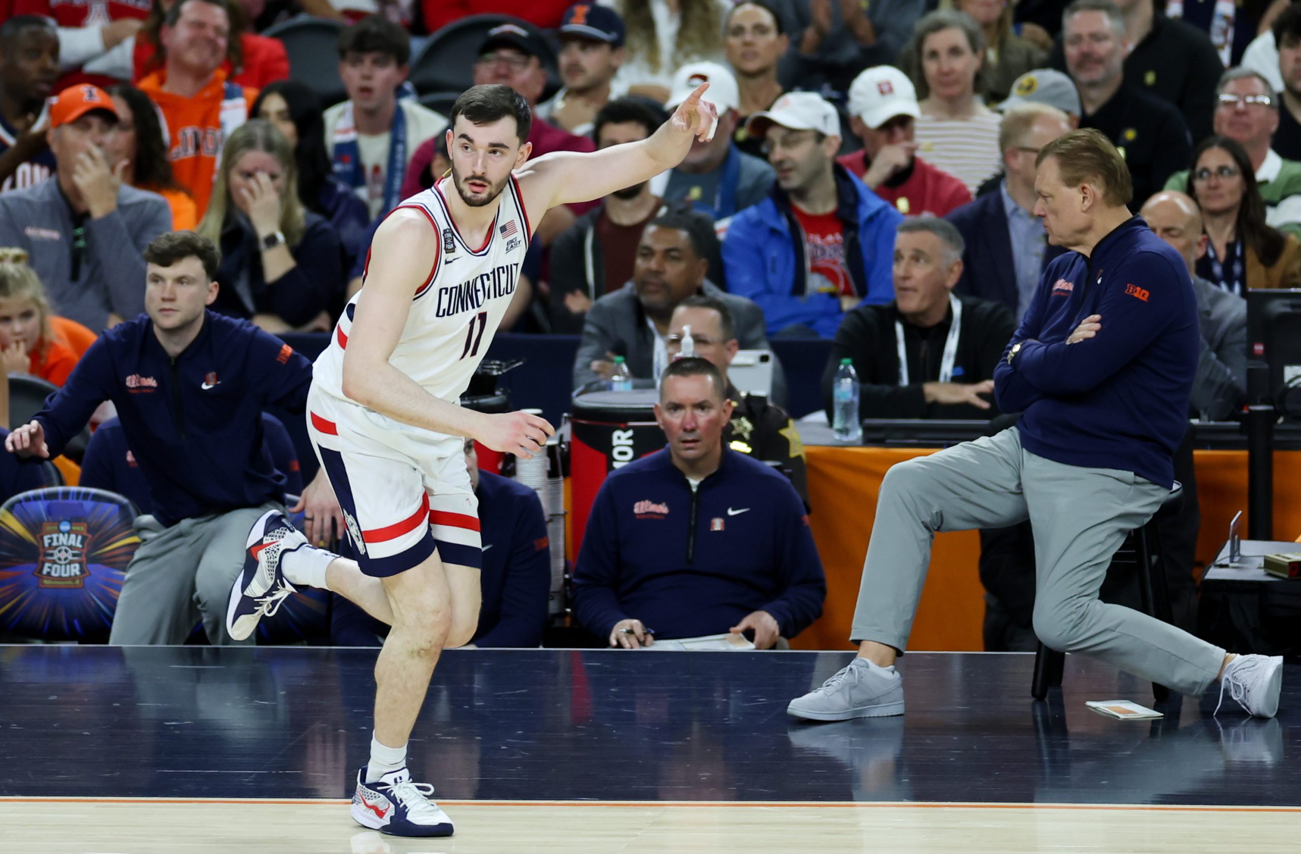 这场比赛我选择支持受让分的一方。尽管密歇根大学表现得像一台无情的机器,但在中立场地进行的季后赛中,面对丹·赫尔利执教的球队,让出整整7分对我来说实在难以接受。赫尔利教练在康涅狄格大学执教期间,从未在第二轮之后输过球,在甜蜜16强及之后的比赛中保持着完美的11胜0负战绩。本赛季他的球队天赋异禀且经验丰富。密歇根大学在四强赛中以91-73大胜的亚利桑那队,缺乏康涅狄格大学所拥有的老将经验。当年轻的野猫队早早落后时,他们没有一个领袖能够稳定军心。而康涅狄格的亚历克斯·卡拉班已经拥有两枚总冠军戒指。康涅狄格大学的防守韧性足以将分差控制在几个回合之内。